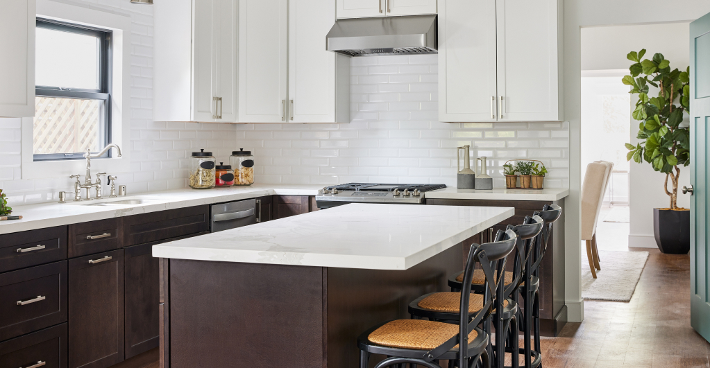 • In the kitchen, paired natural wood and white shaker cabinets to balance modern and rustic styles